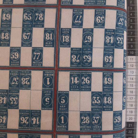 Patchwork stof, råhvid med små røde blomster i streg tegning.