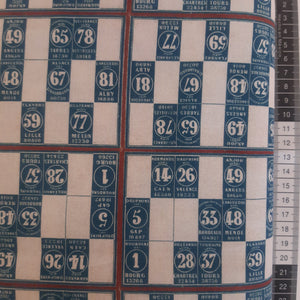 Patchwork stof blå og råhvide tal, bingo banko plader.